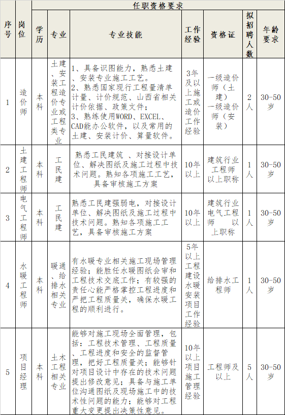 公開招聘專業(yè)技能人才,其中工程項目經(jīng)理5人,土建工程師1人,造價師2人,水暖工程師1人,電氣工程師1人。